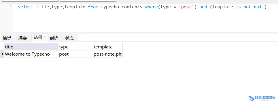 select title,type,template from typecho_contents where(type = 'post') and (template != 'post-note.php')