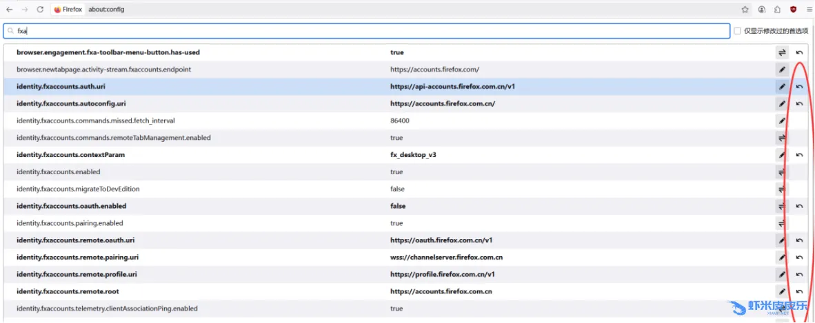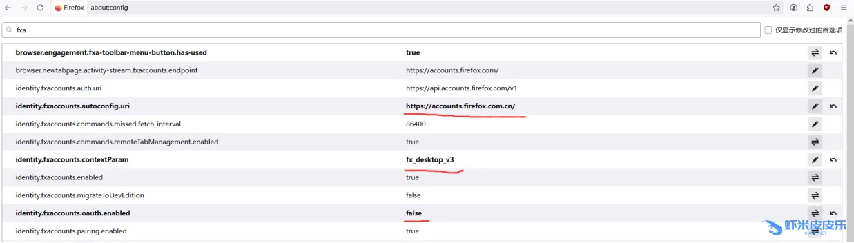identity.fxaccounts.oauth.enabled4.将identity.fxaccounts.autoconfig.uri的选项改为https://accounts.firefox.com.cn/, identity.fxaccounts.contextParam的选项由oauth_webchannel_v1改为fx_desktop_v3,identity.fxaccounts.oauth.enabled的选项由true改为false,然后关闭页面,重启浏览器。