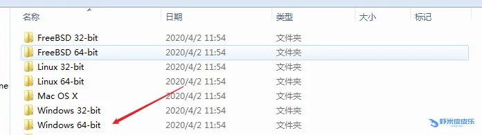 解压都得到一堆文件,对应你自己的服务器,windows,Linux等,这里我们以windows为例,打开Windows 64-bit我们找到对应我们服务器配置的文件夹。