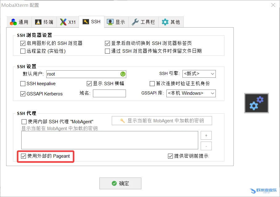 进入 MobaXterm 设置,然后选择 SSH 标签,勾选使用外部的 Pagent,这是汉化版,原版英文是什么我不知道。
