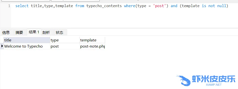 select title,type,template from typecho_contents where(type = 'post') and (template != 'post-note.php')