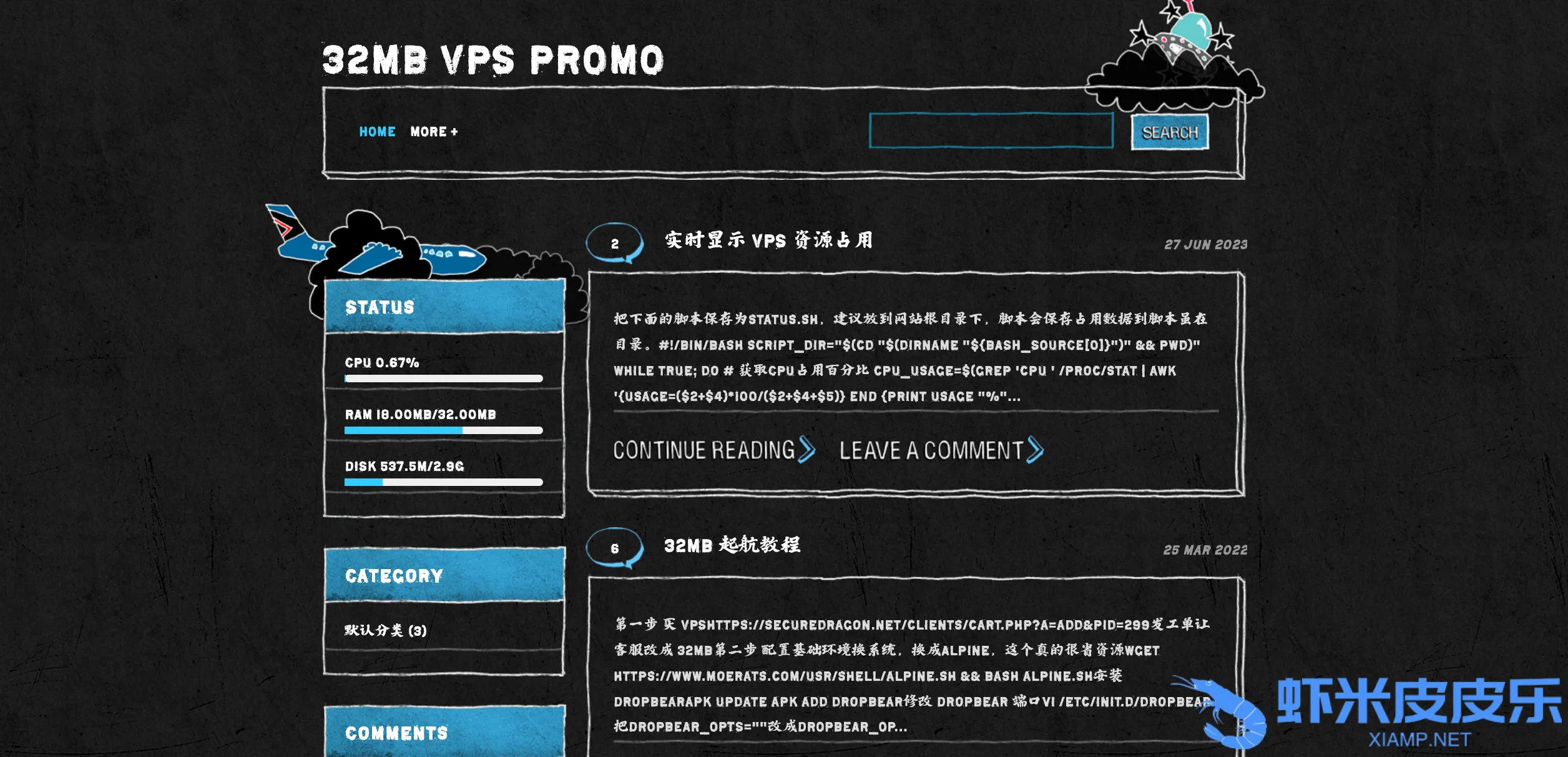 一款来自10多年前的黑色主题,由《虾米皮皮乐》修复在新版 Typecho 下评论显示的小问题,引入了一款个性化字体,支持了二级菜单,在侧边栏增加了 VPS 实时占用展示模块。