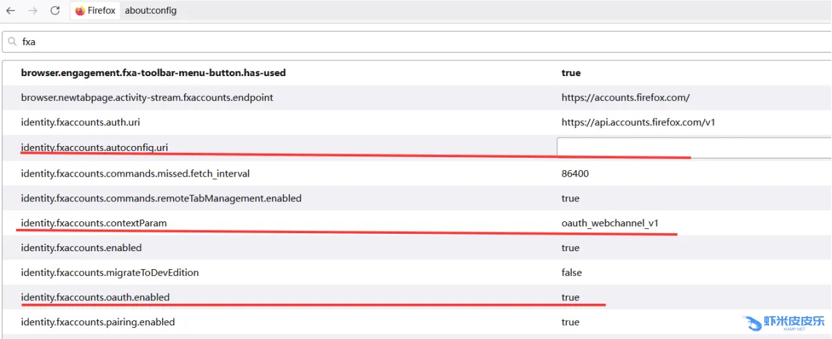 identity.fxaccounts.oauth.enabled4.将identity.fxaccounts.autoconfig.uri的选项改为https://accounts.firefox.com.cn/, identity.fxaccounts.contextParam的选项由oauth_webchannel_v1改为fx_desktop_v3,identity.fxaccounts.oauth.enabled的选项由true改为false,然后关闭页面,重启浏览器。