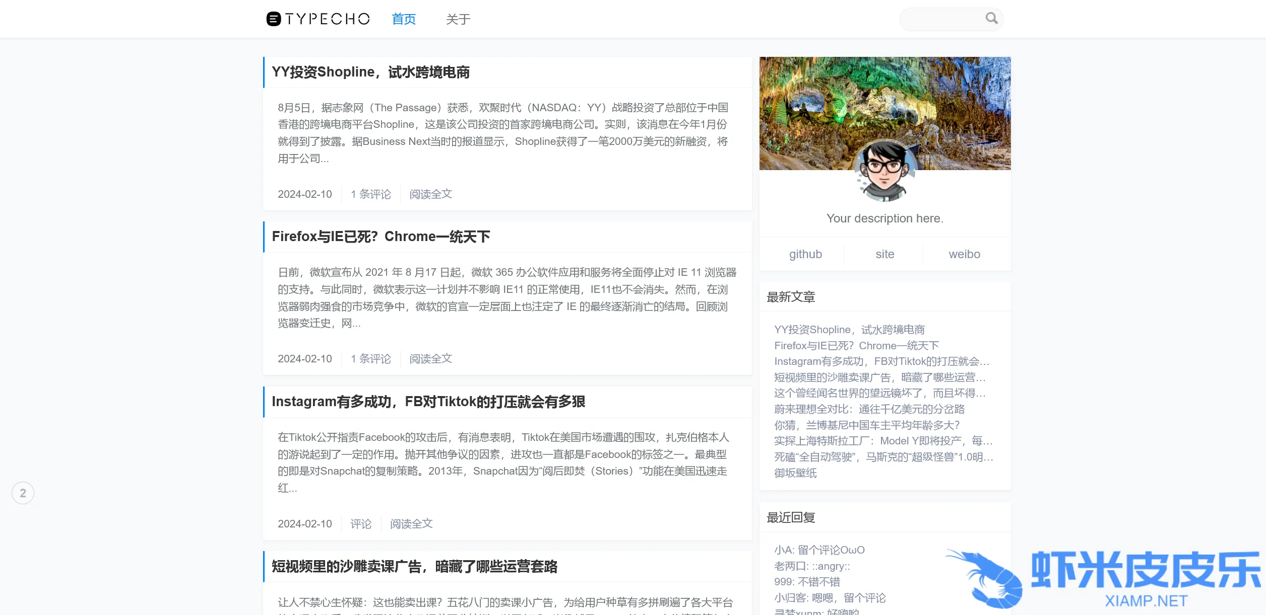 🎨 Typecho主题 Minimalism:一款简约双栏主题 Ryan 2024-05-14 无人评论 2517 阅读 主题简介多端自适应极简主义的typecho主题主题功能features:title: 简雅高贵details: 极简主义,蓝白基调,素雅高贵title: 极速浏览体验details: 使用 InstantClick.js 优化浏览速度title: 自带独立页面模板details: 每日必应图片、每日故事、留言板关于主题缺点主题截图Minimalism 首页Minimalism 留言板主题使用(暂无)主题历史(暂无) 资源预览 其他预览 资源下载 下载地址 Typecho判断插件是否激活 上一篇 05-13 XMLiving 主题更新日志 05-20 下一篇 随机推荐 Typecho 华为云存储插件 ObsUpload JOE:简单两栏博客主题 通过JS和PHP实现网站夜间模式的自动切换 ZiBll 3.3-专为博客、自媒体、资讯类网站开发的 WordPress 主题 精选留言 昵称 邮箱 网站 评论框 取消回复 提交评论 |´・ω・)ノ ヾ(≧∇≦*)ゝ (☆ω☆) (╯‵□′)╯︵┴─┴  ̄﹃ ̄ (/ω\) ∠( ᐛ 」∠)_ (๑•̀ㅁ•́ฅ) →_→ ୧(๑•̀⌄•́๑)૭ ٩(ˊᗜˋ*)و (ノ°ο°)ノ (´இ皿இ`) ⌇●﹏●⌇ (ฅ´ω`ฅ) (╯°A°)╯︵○○○ φ( ̄∇ ̄o) ヾ(´・ ・`。)ノ" ( ง ᵒ̌皿ᵒ̌)ง⁼³₌₃ (ó﹏ò。) Σ(っ °Д °;)っ ( ,,´・ω・)ノ"(´っω・`。) ╮(╯▽╰)╭ o(*////▽////*)q >﹏< ( ๑´•ω•) "(ㆆᴗㆆ) (。•ˇ‸ˇ•。)