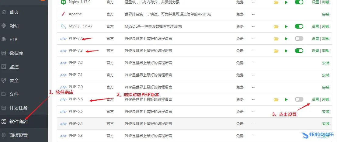 1.进入宝塔面板,点击软件商店,找到你网站对应的php版本,如下图操作,点击设置。