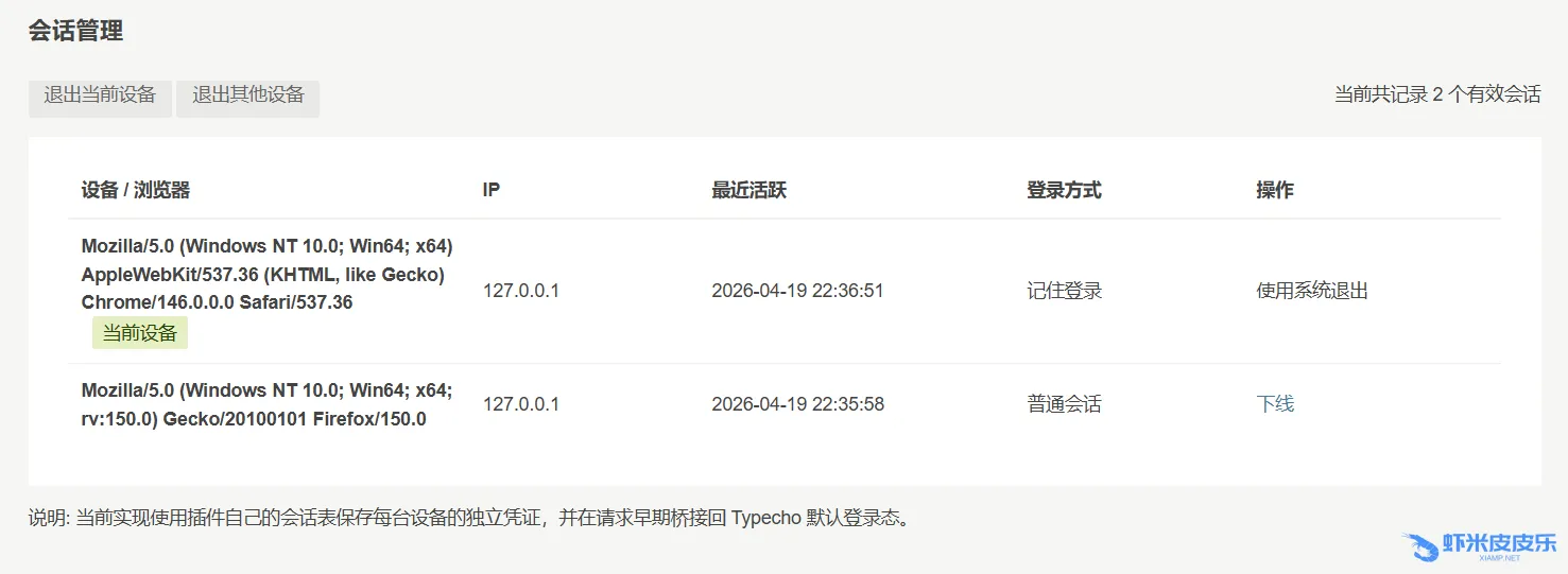 SessionManagement文件夹上传到/usr/plugins/SessionManagement目录 登录 Typecho 后台,进入控制台 → 插件 → Session Management → 启用