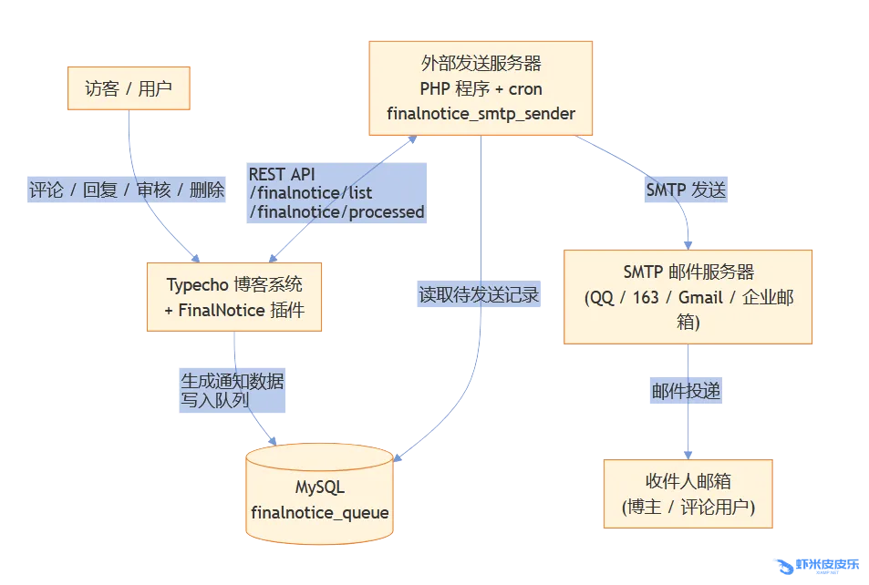 插件只负责生成回复通知队列。负责发送是另外的监控端。具体历程如图所示。