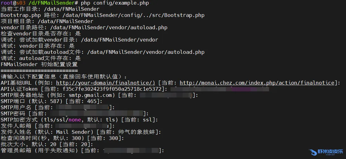 /usr/bin/php install.php- 配置 FNMailSender,按照提示输入API信息、SMTP配置等。