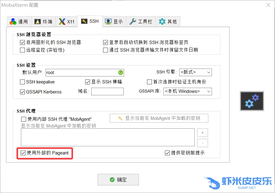 进入 MobaXterm 设置,然后选择 SSH 标签,勾选使用外部的 Pagent,这是汉化版,原版英文是什么我不知道。